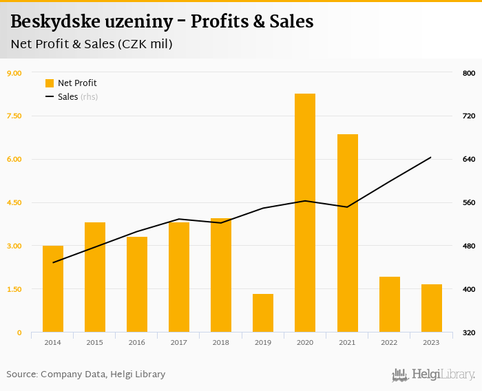 Beskydske uzeniny made a net profit of CZK 1.66 mil in 2023, down 14.1% compared to the previous year. Total sales reached CZK 643 mil, which is up 7.62% when compared to the previous year.