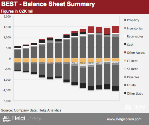 In line with the macro trends, the Company's sales have been falling since 2008. In 2012, sales reached CZK 834 mil, down 23% from the Company's record year 2008. Profit fell even more (by 77% against 2008) to only CZK 22 mil in 2012.
