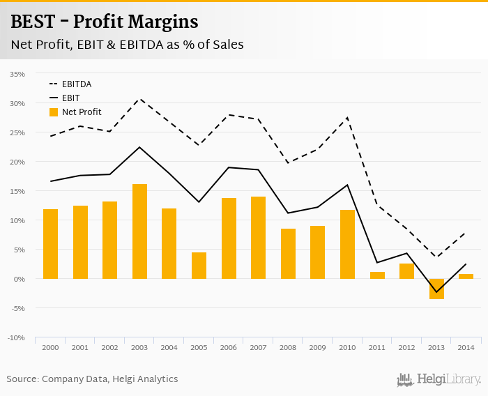 This translates into a net margin of 0.883%. Historically, between 2000 and 2014, the firm’s net margin reached a high of 16.2% in 2003 and a low of -3.42% in 2013. The average net margin in the last five years amounted to 2.60%.