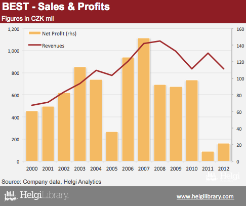 In line with the macro trends, the Company's sales have been falling since 2008. In 2012, sales reached CZK 834 mil, down 23% from the Company's record year 2008. Profit fell even more (by 77% against 2008) to only CZK 22 mil in 2012.