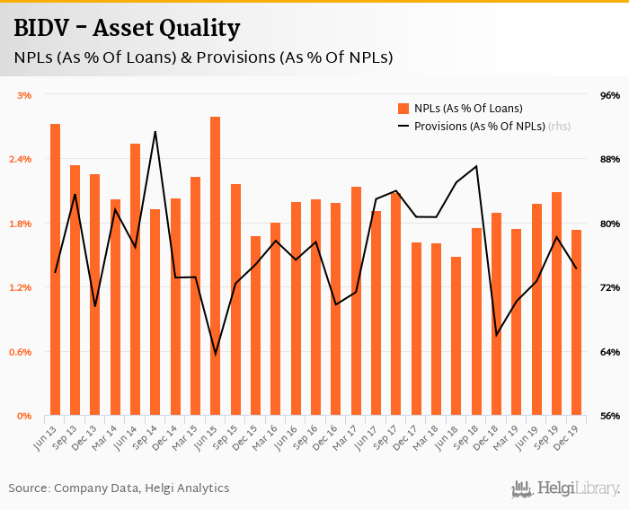 BIDV's non-performing loans reached 1.74% of total loans at the end of 2019-12-31, down from 1.90% compared to the previous year. Historically, the NPL ratio hit an all time high of 2.80% in 2015-06-30 and an all time low of 1.49% in 2018-06-30.