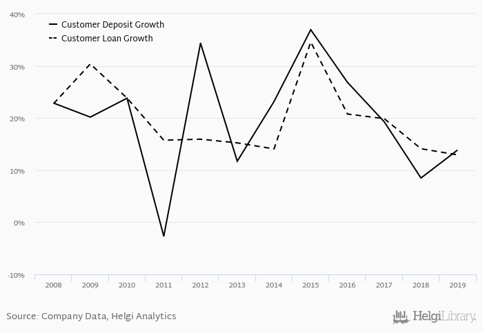 On the other hand, bank's customer deposit growth amounted to 13.9% at the end of 2019, up from 8.49% when compared to the previous year. Historically, the bank’s deposit growth reached an all time high of 36.9% in 2015 and an all time low of -2.68% in 2011. In the last decade, the average annual loan growth amounted to 19.0%.