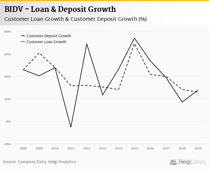 BIDV's customer loan growth reached 12.9% in 2019, down from 14.1% compared to the previous year. Historically, the bank’s loans growth reached an all time high of 34.6% in 2015 and an all time low of 12.9% in 2019. In the last decade, the average annual loan growth amounted to 18.6%.