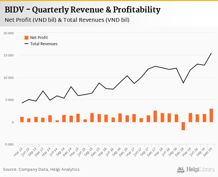 On the other hand, bank’s revenues amounted to an all time high of VND 15,430 bil in 4Q2019 and an all time low of VND 4,220 bil in 1Q2013. The average revenues in the last six quarters reached VND 12,247 bil.