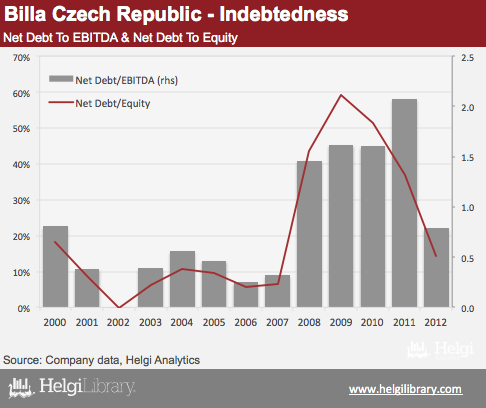 In spite of the losses, BILLA's net debt has fallen from 51% in 2010 to only 14% in 2012.