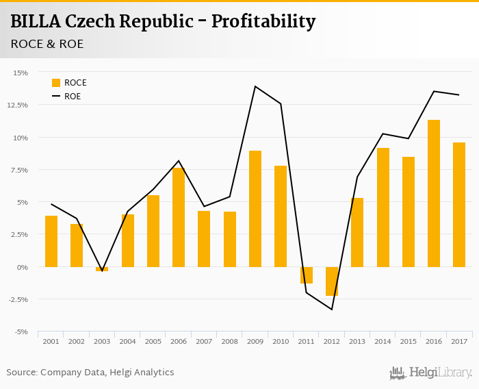 BILLA Czech Republic made a net profit of CZK 370 mil in 2017, down 21.2% compared to the previous year. Historically, between 2000 and 2017, the company's net profit reached a high of CZK 469 mil in 2016 and a low of CZK -100 mil in 2012.