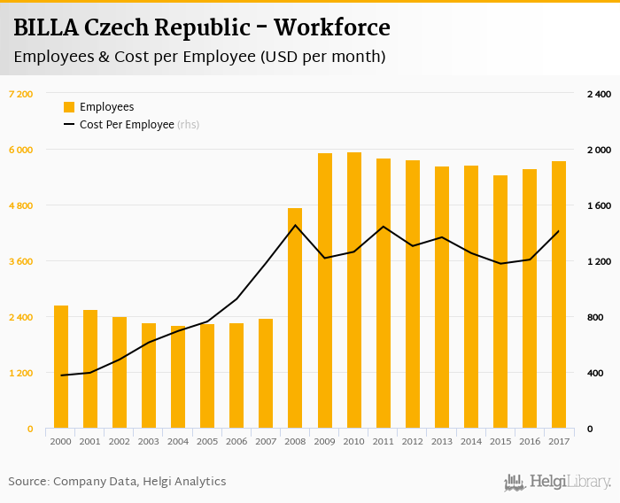 BILLA Czech Republic employed 5,748 employees in 2017, up 3.07% compared to the previous year. Historically, between 2000 and 2017, the firm's workforce hit a high of 5,946 employees in 2010 and a low of 2,202 employees in 2004.