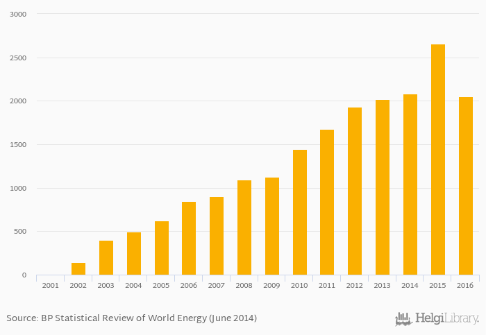 Biofuels production in tonnes of oil equivalent fell 22.6% to 2,053 kt in China in 2016, according to World Bank / EIA.