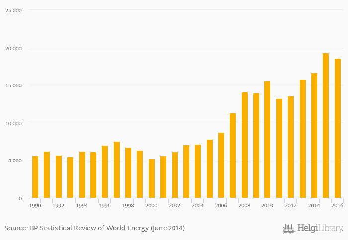 Biofuels production in tonnes of oil equivalent fell 4.04% to 18,552 kt in Brazil in 2016, according to World Bank / EIA.
