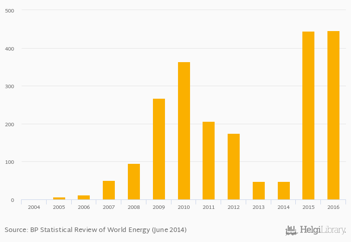 Biofuels production in tonnes of oil equivalent rose 0.274% to 446 kt in Finland in 2016, according to World Bank / EIA.