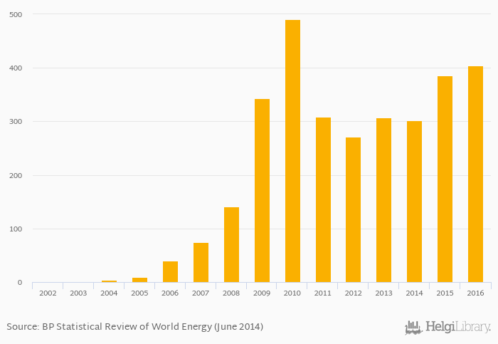 Biofuels production in tonnes of oil equivalent rose 5.00% to 404 kt in South Korea in 2016, according to World Bank / EIA.