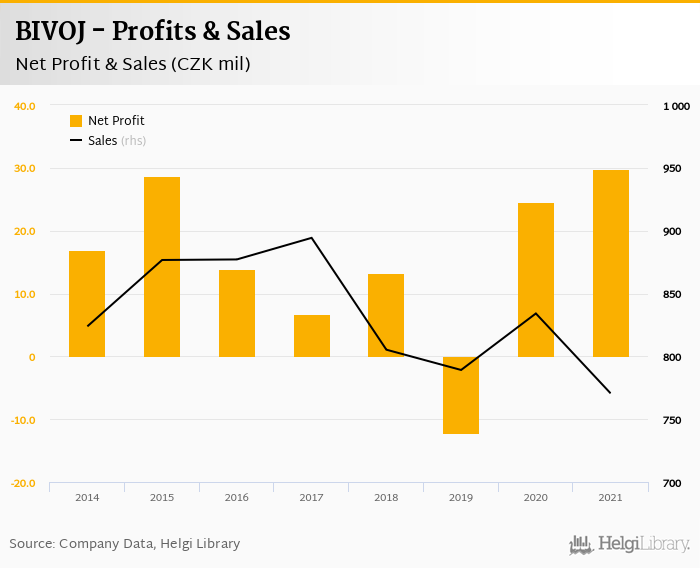 BIVOJ made a net profit of CZK 29.8 mil in 2021, up 21% compared to the previous year. Total sales reached CZK 771 mil, which is down 7.62% when compared to the previous year.