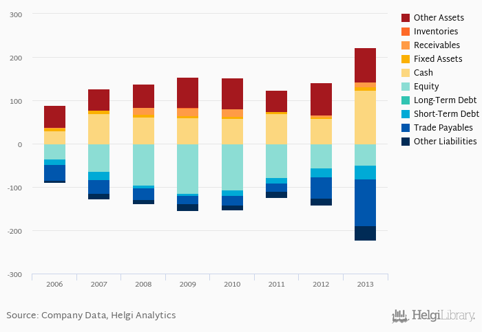 Net debt against equity is down 1.29 pp from five years ago (-0.573). The ratio against EBITDA decreased from -1.14x seen in 2008 to -1.36x.
