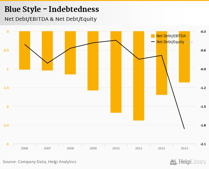 Blue Style's net debt stood at CZK -92.8 mil and accounted for -1.87 of equity at the end of 2013. The ratio is down 1.18 pp compared to the previous year.
