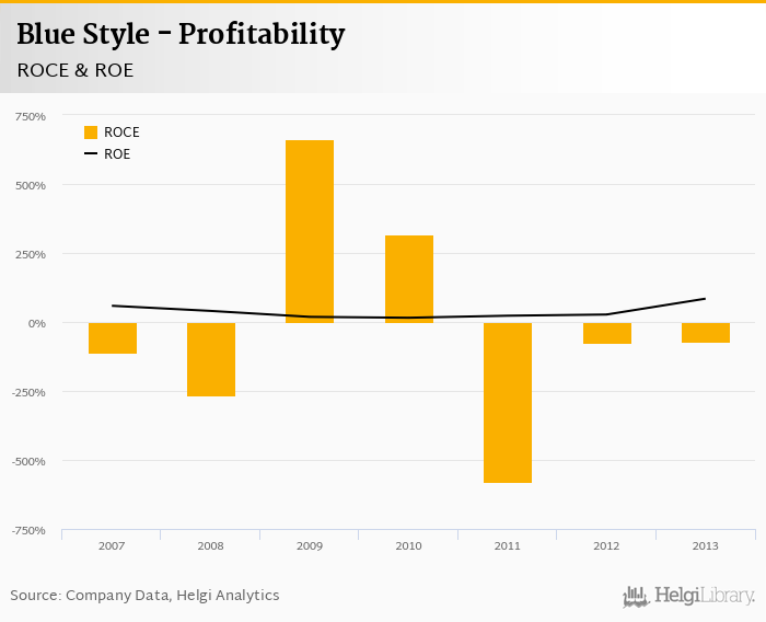 As far as Blue Style's peers are concerned, Cedok generated ROE of 5.46% and ROCE of 7.75% in 2013. CK Fischer's profitability reached 13.2% and 14.5%, respectively. EXIM Tours operated with 13.9% and -89.1% returns in 2013.
