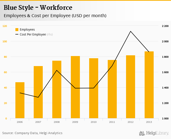 Blue Style employed 87.0 employees in 2013, up 6.1% compared to the previous year. Historically, between 2005 and 2013, the firm's workforce hit a high of 87.0 employees in 2013 and a low of 29.0 employees in 2005.