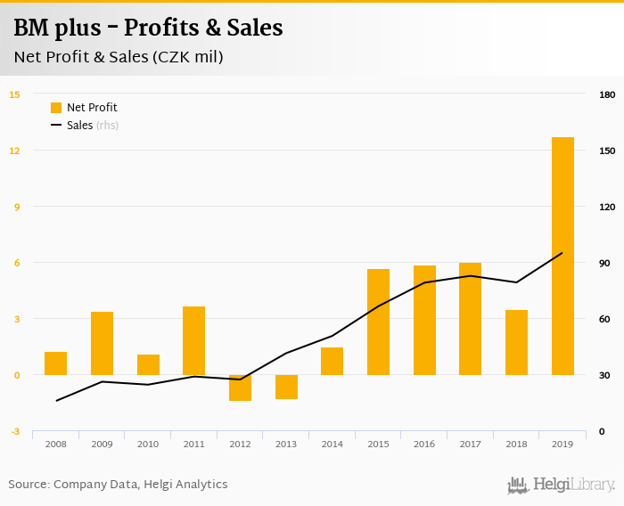 BM plus made a net profit of CZK 12.7 mil in 2019, up 266% compared to the previous year. Total sales reached CZK 95.0 mil, which is up 20.1% when compared to the previous year.