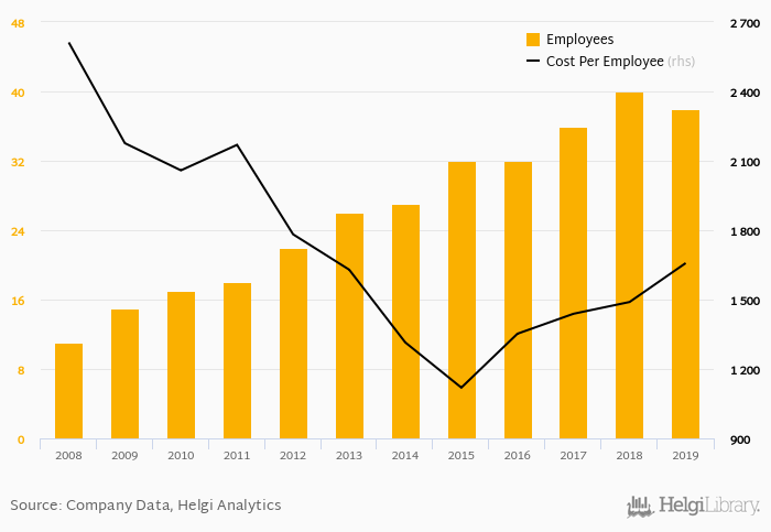 BM plus employed 38.0 employees in 2019, down 5% compared to the previous year. Historically, between 2008 and 2019, the firm's workforce hit a high of 40.0 employees in 2018 and a low of 11.0 employees in 2008.