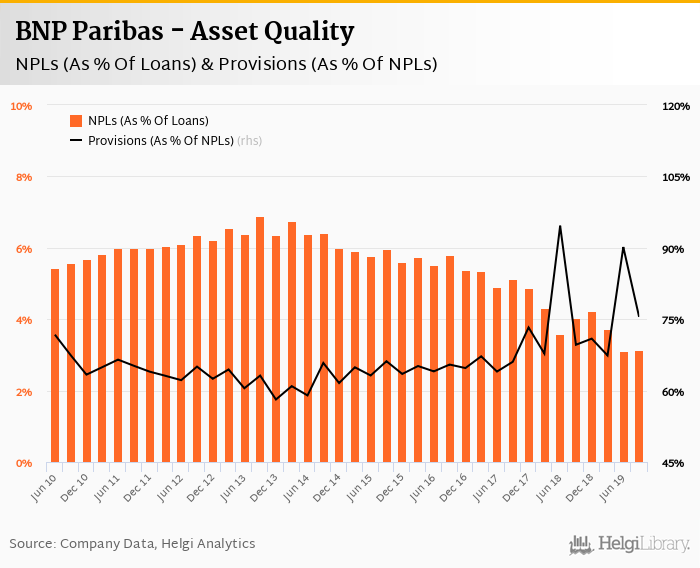 BNP Paribas's non-performing loans reached 3.15% of total loans at the end of 2019-09-30, down from 4.03% compared to the previous year. Historically, the NPL ratio hit an all time high of 6.89% in 2013-09-30 and an all time low of 3.10% in 2019-06-30.