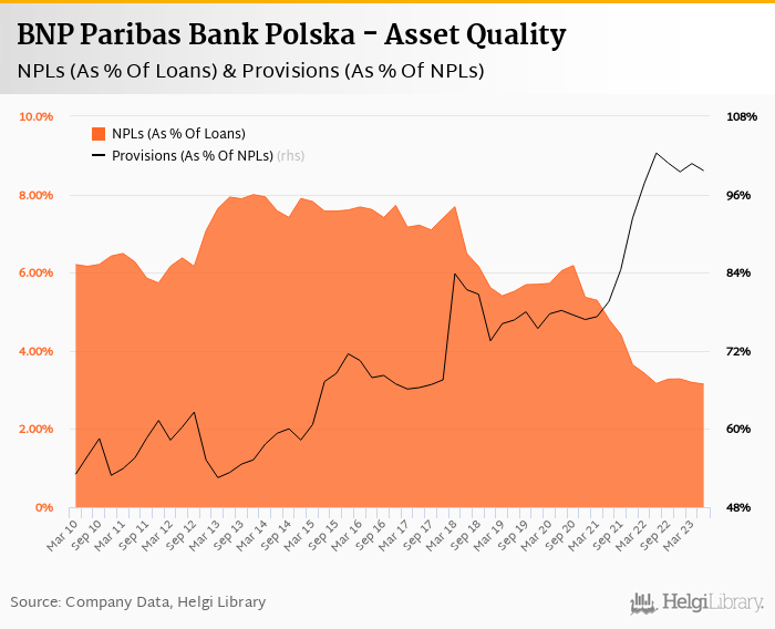 Comparing BNP Paribas Bank Polska with its closest peers, PKO BP operated at the end of 2023-06-30 with NPL ratio of 3.81% and provision coverage of 113%, Pekao with 6.07% and 102% respectively and ING Bank Slaski had 2.59% of bad loans covered with 86.9% by provisions at the end of 2023-06-30.