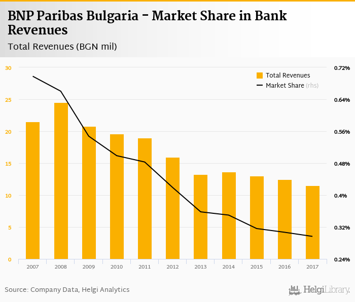 As a result, BNP Paribas Bulgaria accounted for 0.296% of all bank revenues generated by banks in Bulgaria in 2017. Historically, the bank’s market share in total revenues reached an all time high of 0.698% in 2007 and an all time low of 0.296% in 2017.