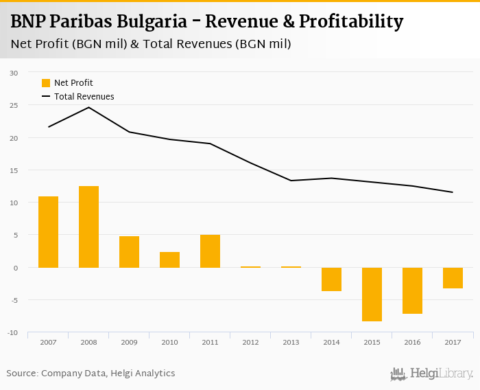 BNP Paribas Bulgaria made a net profit of BGN -3.27 mil under revenues of BGN 11.5 mil in 2017, up 54.2% and -7.84% respectively compared to the previous year.