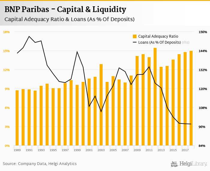 BNP Paribas's capital adequacy ratio reached 15.0% at the end of 2018, up from 14.8% compared to the previous year. Historically, the bank’s capital ratio hit an all time high of 15.5% in 2012 and an all time low of 8.70% in 1992.