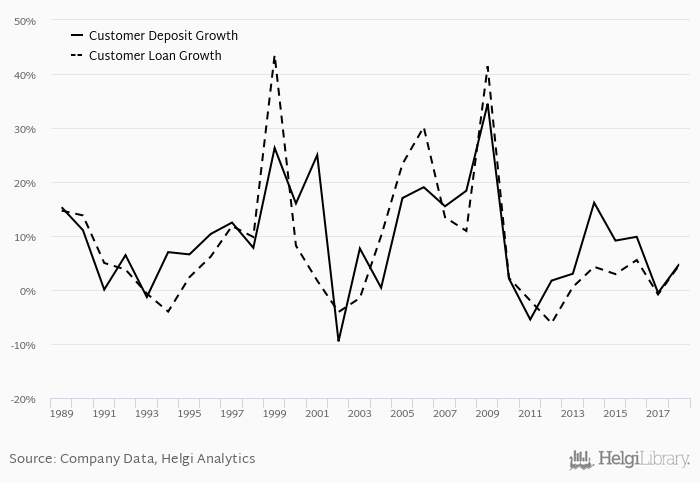 On the other hand, bank's customer deposit growth amounted to 4.81% at the end of 2018, up from -0.540% when compared to the previous year. Historically, the bank’s deposit growth reached an all time high of 34.5% in 2009 and an all time low of -9.50% in 2002. In the last decade, the average annual loan growth amounted to 7.05%.