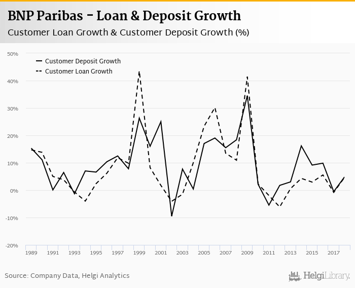 BNP Paribas's customer loan growth reached 4.64% in 2018, up from -0.826% compared to the previous year. Historically, the bank’s loans growth reached an all time high of 43.5% in 1999 and an all time low of -6.14% in 2012. In the last decade, the average annual loan growth amounted to 4.64%.