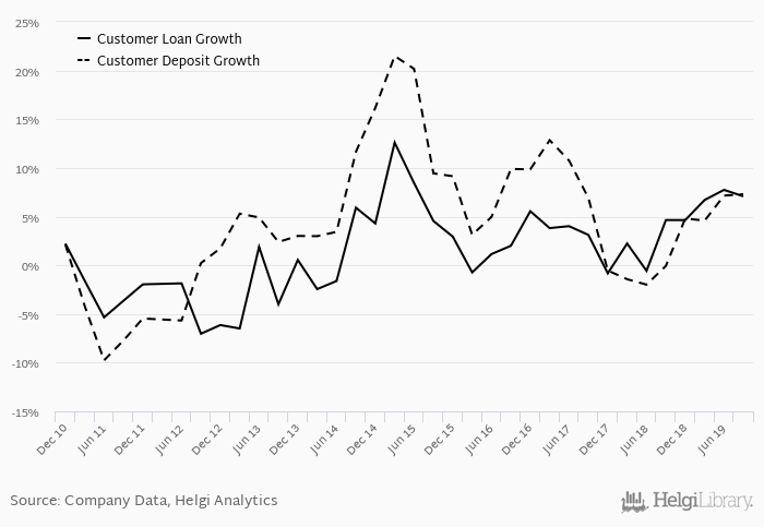 On the other hand, bank's customer deposit growth amounted to 7.29% at the end of 2019-09-30, up from -0.064% when compared to the previous year. Historically, the bank’s deposit growth reached an all time high of 21.5% in 2015-03-31 and an all time low of -9.76% in 2011-06-30. In the last decade, the average annual loan growth amounted to 0%.