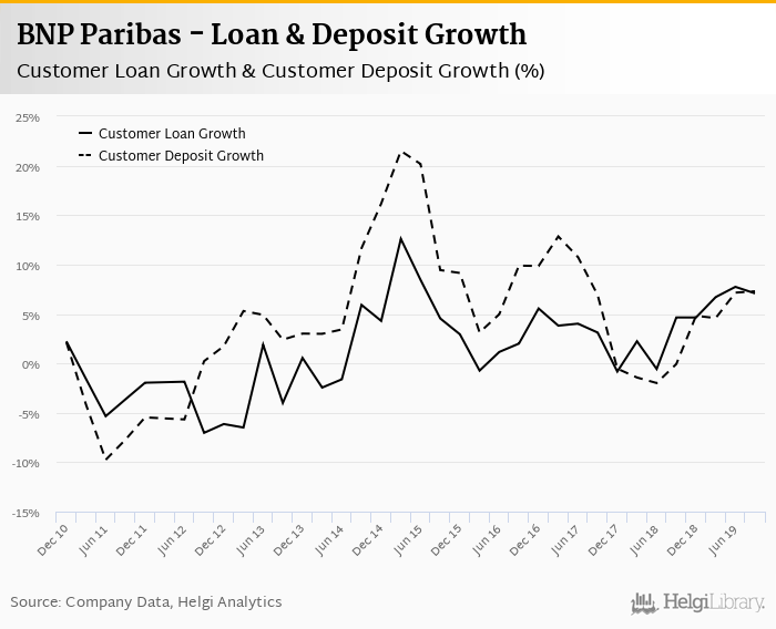 BNP Paribas's customer loan growth reached 7.08% in 2019-09-30, up from 4.64% compared to the previous year. Historically, the bank’s loans growth reached an all time high of 12.6% in 2015-03-31 and an all time low of -7.03% in 2012-09-30. In the last decade, the average annual loan growth amounted to 0%.