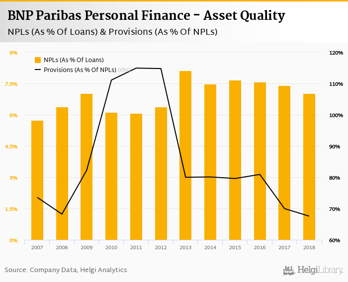 BNP Paribas Personal Finance's non-performing loans reached 7.02% of total loans at the end of 2018, down from 7.41% compared to the previous year. Historically, the NPL ratio hit an all time high of 8.13% in 2013 and an all time low of 5.73% in 2007.