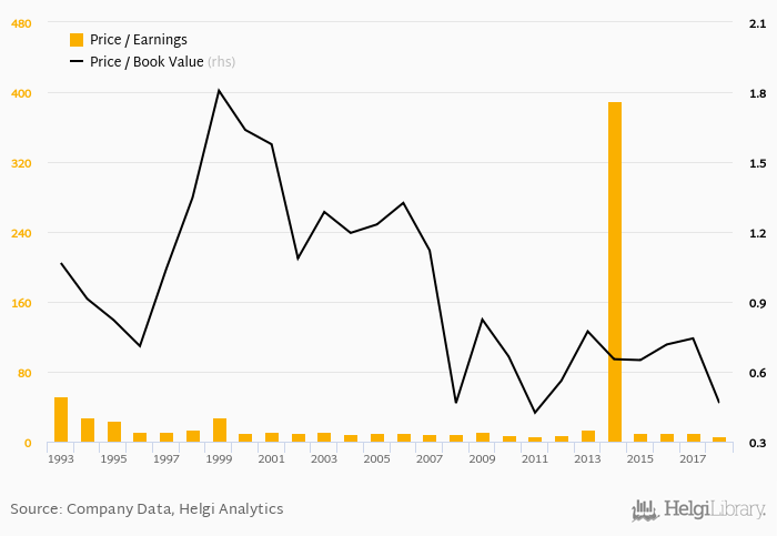 In terms of price to book value, the stock reached 0.466x at the end of 2018. Since 2013, the multiple reached an all time high of 0.743x in 2017 and an all time low of 0.466x in 2018 with an average of 0.646x.