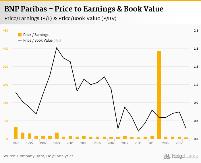 At the end of 2018, the bank traded at price to earnings of 6.54x. Within the last five years, the multiple reached an all time high of 390x in 2014 and an all time low of 6.54x in 2018 with an average of 85.3x.