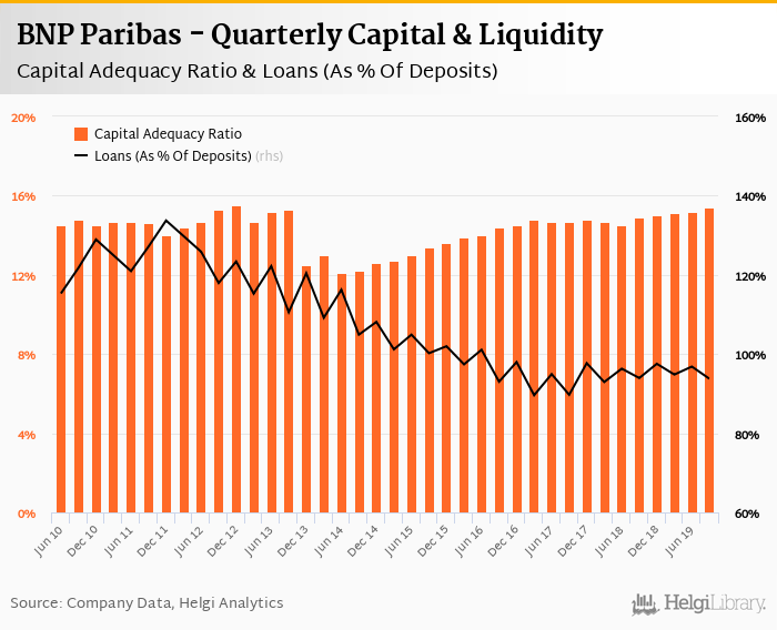 BNP Paribas's capital adequacy ratio reached 15.4% at the end of third quarter of 2019, up from 15.2% when compared to the previous quarter. Historically, the bank’s capital ratio hit an all time high of 15.5% in 4Q2012 and an all time low of 12.1% in 2Q2014.