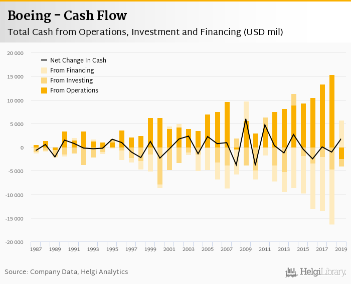 Boeing's operating cash flow stood at USD -2,446 mil in 2019, down 116% when compared to the previous year. Historically, between 1987 - 2019, the firm’s operating cash flow reached a high of USD 15,322 mil in 2018 and a low of USD -2,446 mil in 2019.