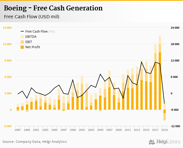 Boeing made a net profit of USD -636 mil with revenues of USD 76,559 mil in 2019, down by 106% and down by 24.3%, respectively, compared to the previous year. This translates into a net margin of -0.831%.
