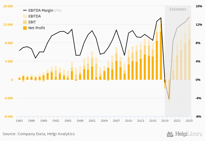 Historically, between 1983 - 2019, the firm’s net profit reached a high of USD 10,460 mil in 2018 and a low of USD -636 mil in 2019. Since 2014, the firm's net profit has decreased 112% or % a year on average.