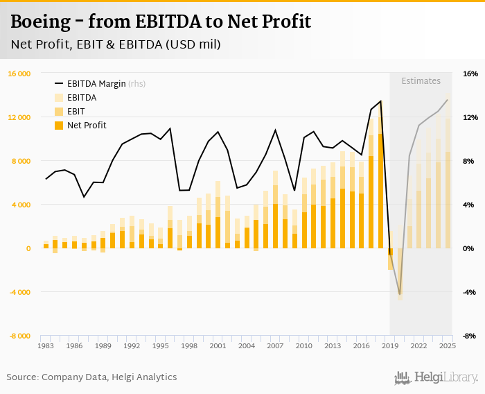 Boeing made a net profit of USD -636 mil with revenues of USD 76,559 mil in 2019, down by 106% and down by 24.3%, respectively, compared to the previous year. This translates into a net margin of -0.831%.