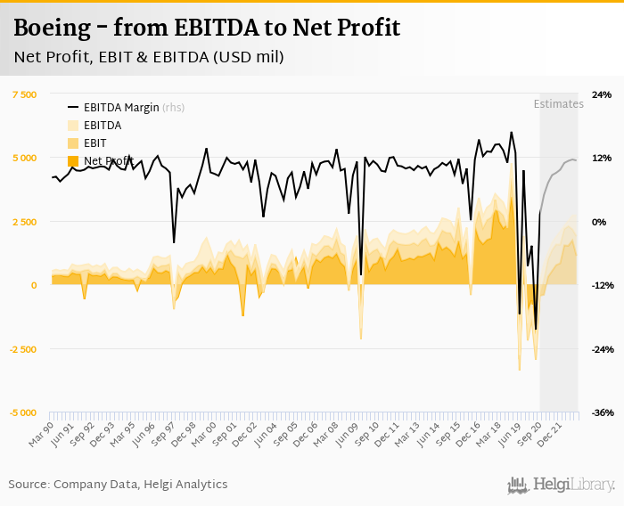 Boeing made a net profit of USD -449 mil with revenues of USD 14,139 mil in 3Q2020, up by 81.1% and up by 19.8%, respectively, compared to the previous year. This translates into a net margin of -3.18%.