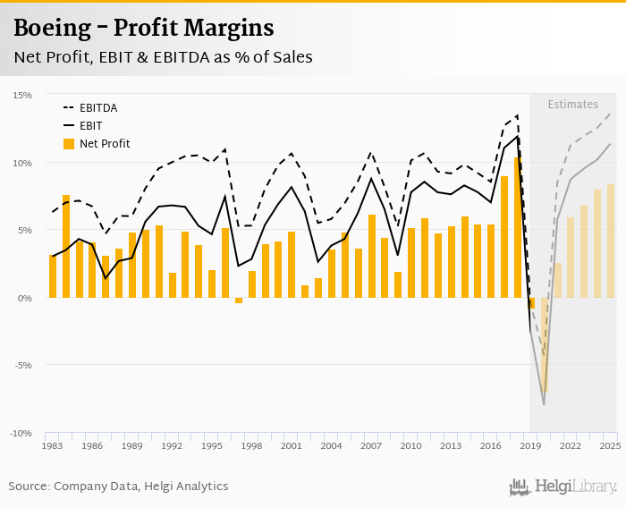 Boeing made a net profit of USD -636 mil with revenues of USD 76,559 mil in 2019, down by 106% and down by 24.3%, respectively, compared to the previous year.