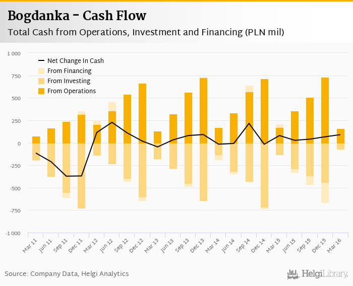 Bogdanka's operating cash flow stood at PLN 159 mil in 1Q2016, down 7.73% when compared to the previous year. Historically, between 1Q2011 - 1Q2016, the firm’s operating cash flow reached a high of PLN 730 mil in 4Q2015 and a low of PLN 77.6 mil in 1Q2011.