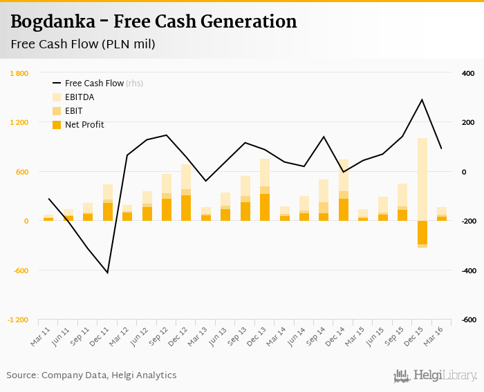 Bogdanka made a net profit of PLN 54.1 mil with revenues of PLN 421 mil in 1Q2016, up by 66.3% and down by 1.8%, respectively, compared to the previous year. This translates into a net margin of -0.410%.