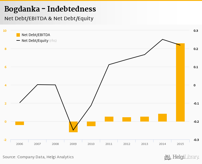 Bogdanka's net debt stood at PLN 460 mil and accounted for 0.218 of equity at the end of 2015. The ratio is down 0.032 pp compared to the previous year.