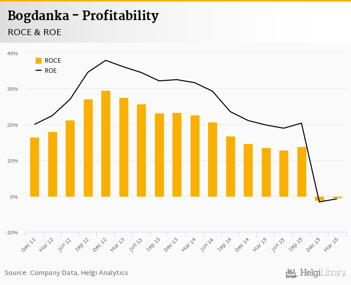 Bogdanka made a net profit of PLN 54.1 mil in 1Q2016, up 66.3% compared to the previous year. Historically, between 1Q2011 and 1Q2016, the company's net profit reached a high of PLN 329 mil in 4Q2013 and a low of PLN -280 mil in 4Q2015.