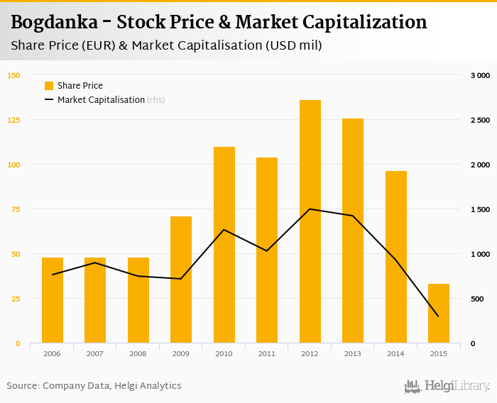 Bogdanka stock traded at EUR 33.2 per share at the end 2015 implying a market capitalization of USD 290 mil.