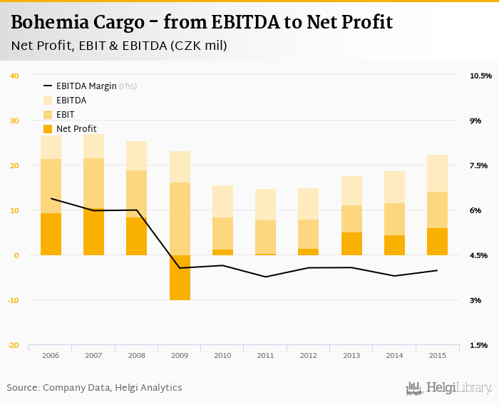 Bohemia Cargo made a net profit of CZK 6.06 mil with revenues of CZK 565 mil in 2015, up by 37.6% and up by 14.1%, respectively, compared to the previous year. This translates into a net margin of 1.07%.