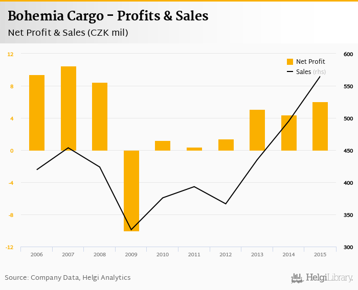 Bohemia Cargo made a net profit of CZK 6.06 mil in 2015, up 37.6% compared to the previous year. Total sales reached CZK 565 mil, which is up 14.1% when compared to the previous year.