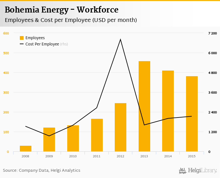 Bohemia Energy employed 382 employees in 2015, down 7.06% compared to the previous year. Historically, between 2008 and 2015, the firm's workforce hit a high of 459 employees in 2013 and a low of 30.0 employees in 2008.