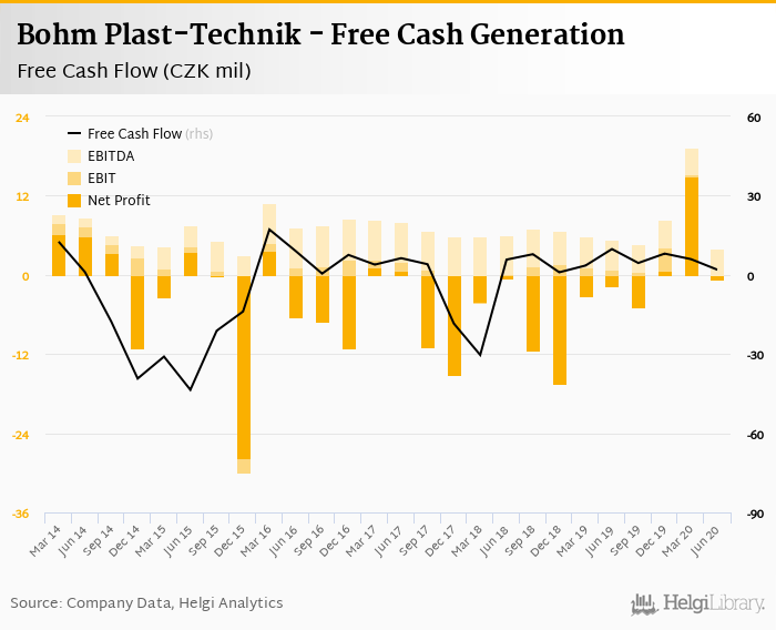 The company generated cash, defined by a sum of net profit and depreciation, of CZK 3.28 mil or 6.81% of sales. When investments are excluded, free cash flow reached CZK 1.94 mil, or 4.03% of sales in 2Q2020.